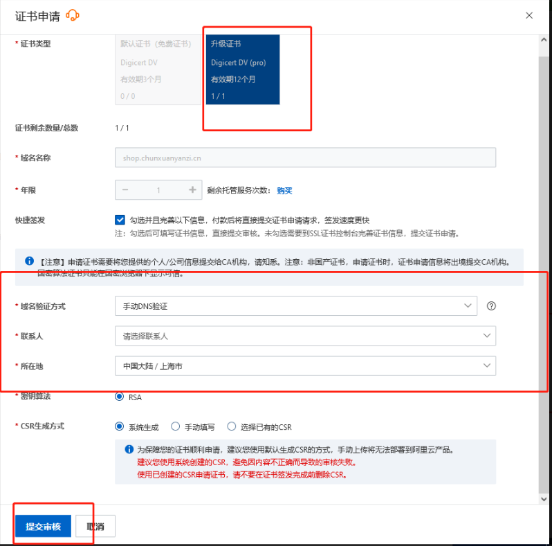 4.下一步-验证-提交审核。(如果你申请证书的域名不在该账号,你需要在域名的管理里,添加一条特定的 DNS 记录,按照以下信息添加)