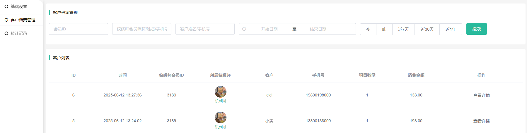 二、点击进入顾客档案管理页面,显示管理的所有顾客档案,可通过手机号、客户名称、项目名称、老师名称筛选